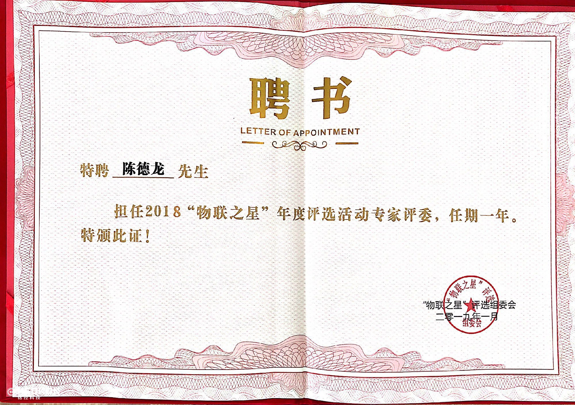 祝賀我司總經理陳德龍先生,擔任“物聯之星”專家評委